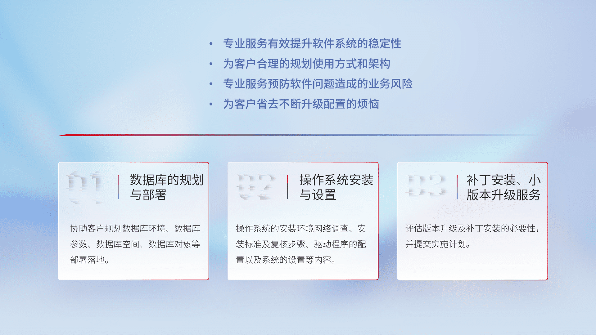 为客户提供软件规模升级、、、快速部署、、按需配置的专业服务,,,,从数据库的规划与部署到操作系统的安装与设置,,再到补丁安装和小版本升级提供支持。。。。